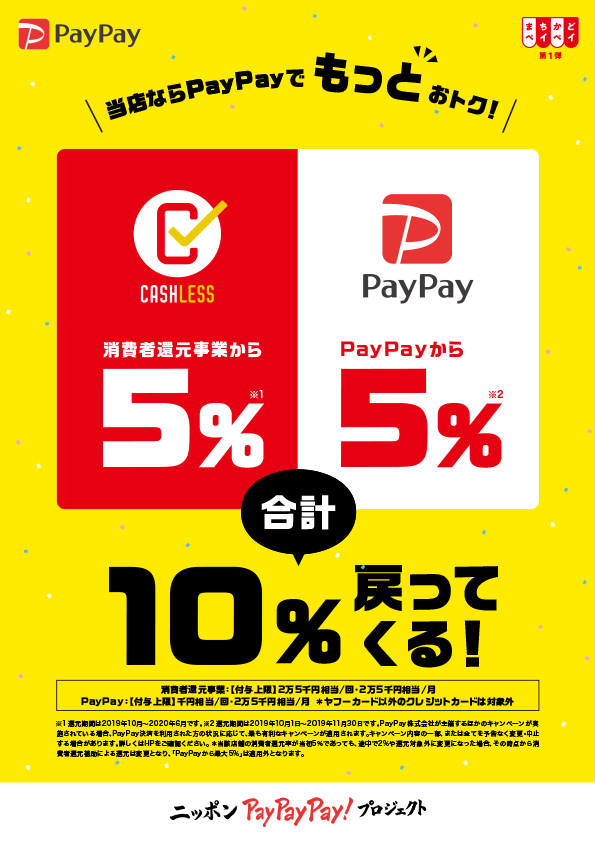 キャンペーン期間中(※1)に、対象店舗における対象取引(※2)について、「PayPay」をご利用いただいた方に対し、消費者還元補助による還元5% に加えて、5%(PayPay利用特典の1.5%を含む)のPayPayボーナスを加算し、合計10%を付与します。