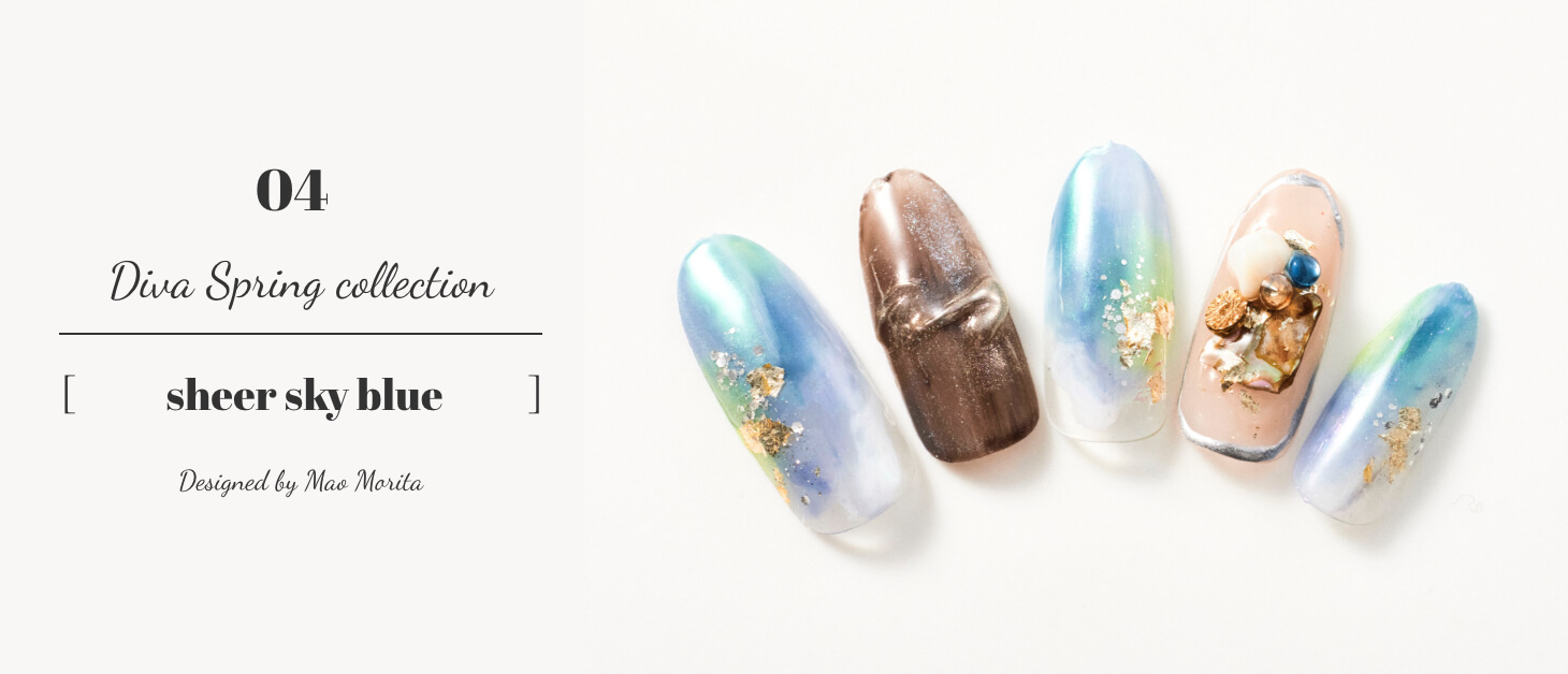 ブルーとブラウンの色合いがエレガントすぎないカジュアル感を演出。ミラーやシェルを取り入れてラフな仕上がりにまとめ、オンもオフも頑張りすぎない、オシャレを大切にしている女性をイメージしたデザイン。可愛すぎない、爽やかな気持ちでお出掛けしたい時に。