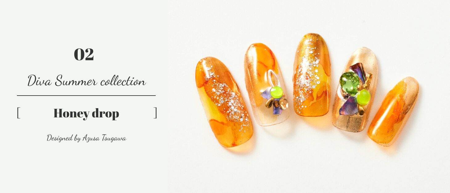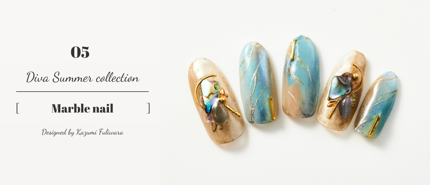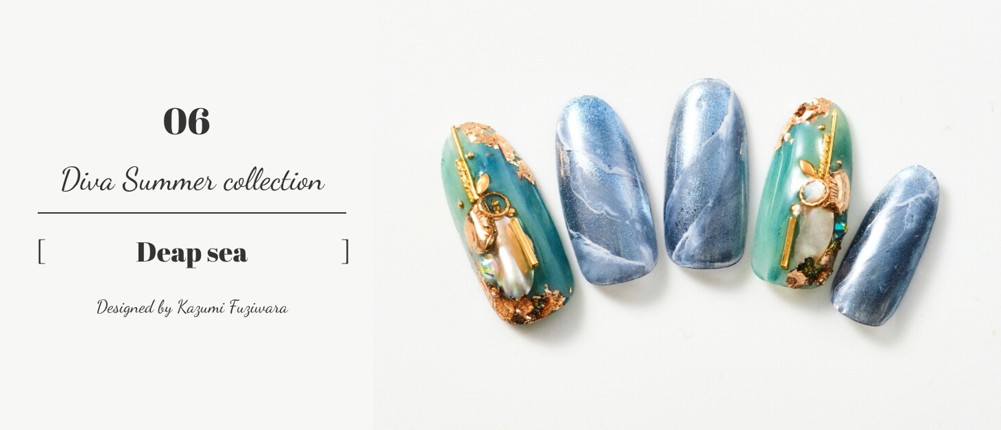 色味に濃淡をつけることで奥行きを出し、夏の透き通った青い海を表現。ストーンやパーツを重ねて置くことでデザイン性もアップ。くすみカラーを使用しているので落ち着いた雰囲気にもバッチリ。真夏におすすめのデザイン。