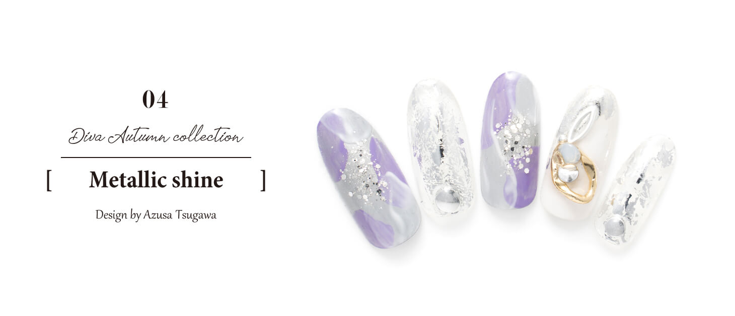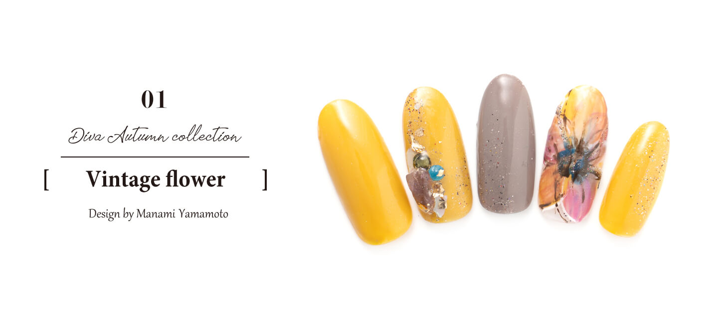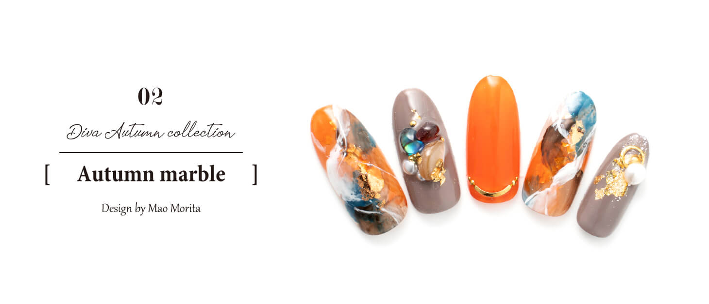 パンプキンのようなオレンジをはじめ、秋ならでは色合いでレトロ感を表現。深みのあるマーブルの奥には、さりげない輝きを。シェルストーンとマーブルが調和し合い、アートな指先を演出します。
