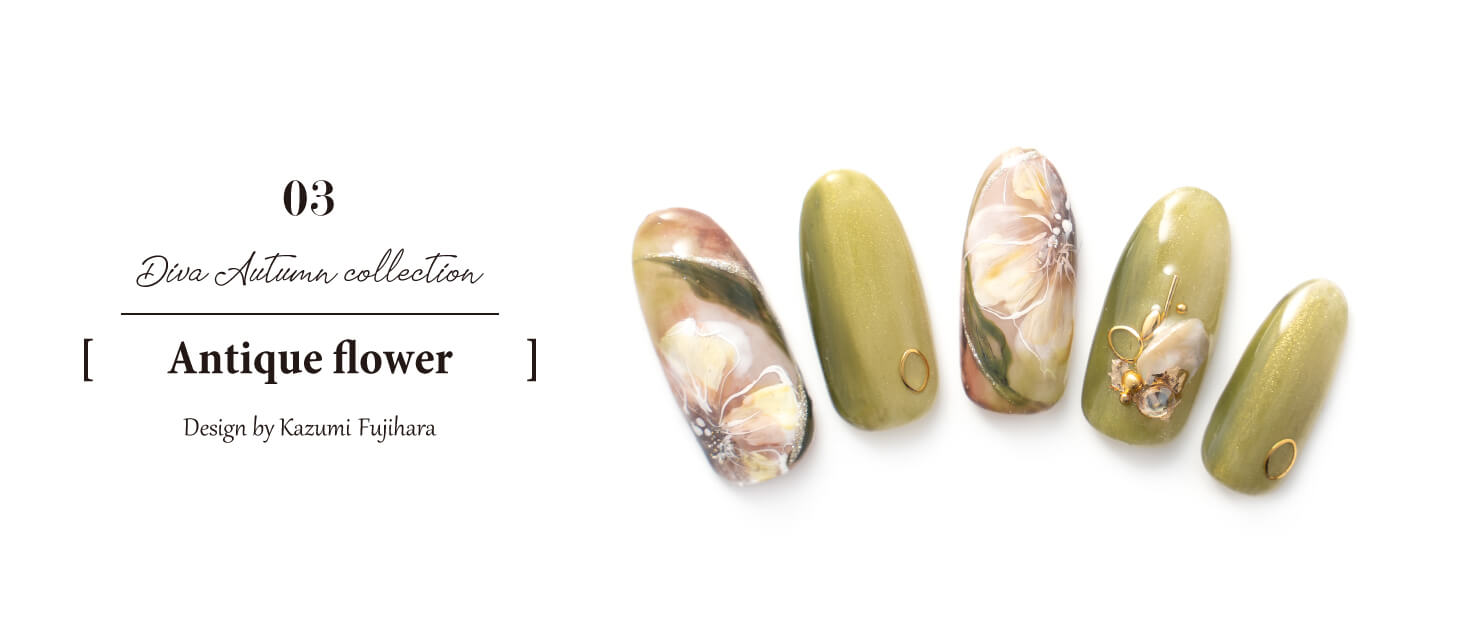 アンティークグリーンが秋っぽさを演出。1色1色濃淡をつけ、花びらが重なり合うように描き込むことで、ストーンを載せなくても奥行きを感じる大人ネイルへ。秋が深まるこっくりした季節にオススメです。
