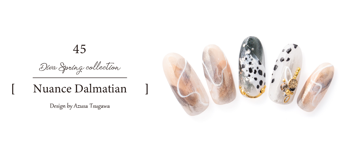 ベージュを奥行きのあるクリアブラックとMIXさせてミラーの輝きをプラスし透明感を出しました。POINTは挑戦しやすい一部分だけアニマルのダルメシアン柄をペイントしました。