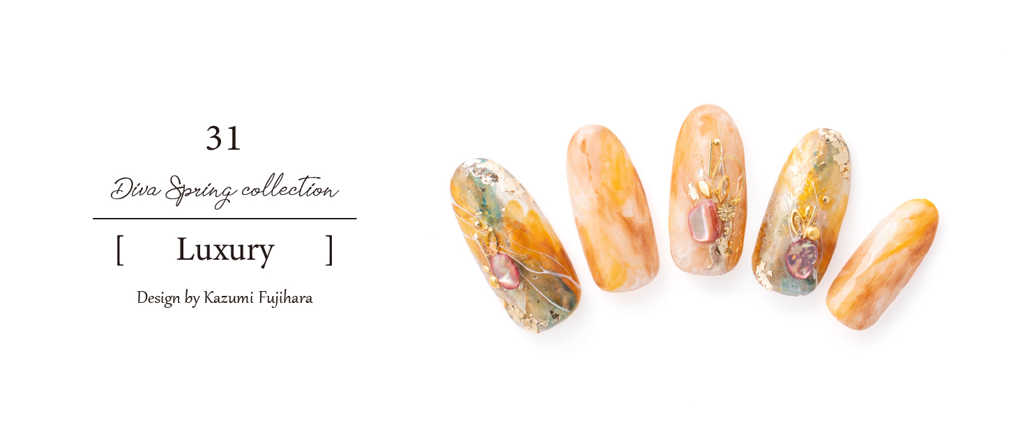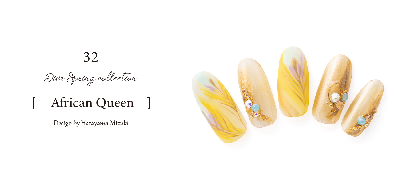 African queenをイメージして、金ぱくの上にカラーを重ね合わせ、その上からゴールドのパーツを使用することで高級感のあるデザインにしました。