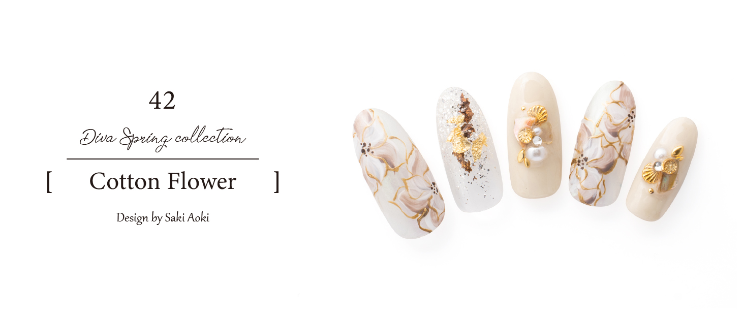 指先を綺麗に見せてくれるコットンカラーに、オーロラミラーをお花のベースにすることで奥行きをプラス。金箔やシェルをあしらいシックでフェミニンな印象に。