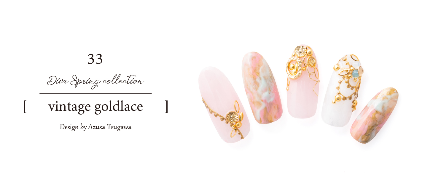 鍵網コットンレースの柄を流行のヴィンテージゴールドのライナーでお花をイメージしてアートしました。ビジューストーンのフレンチがポイントです。