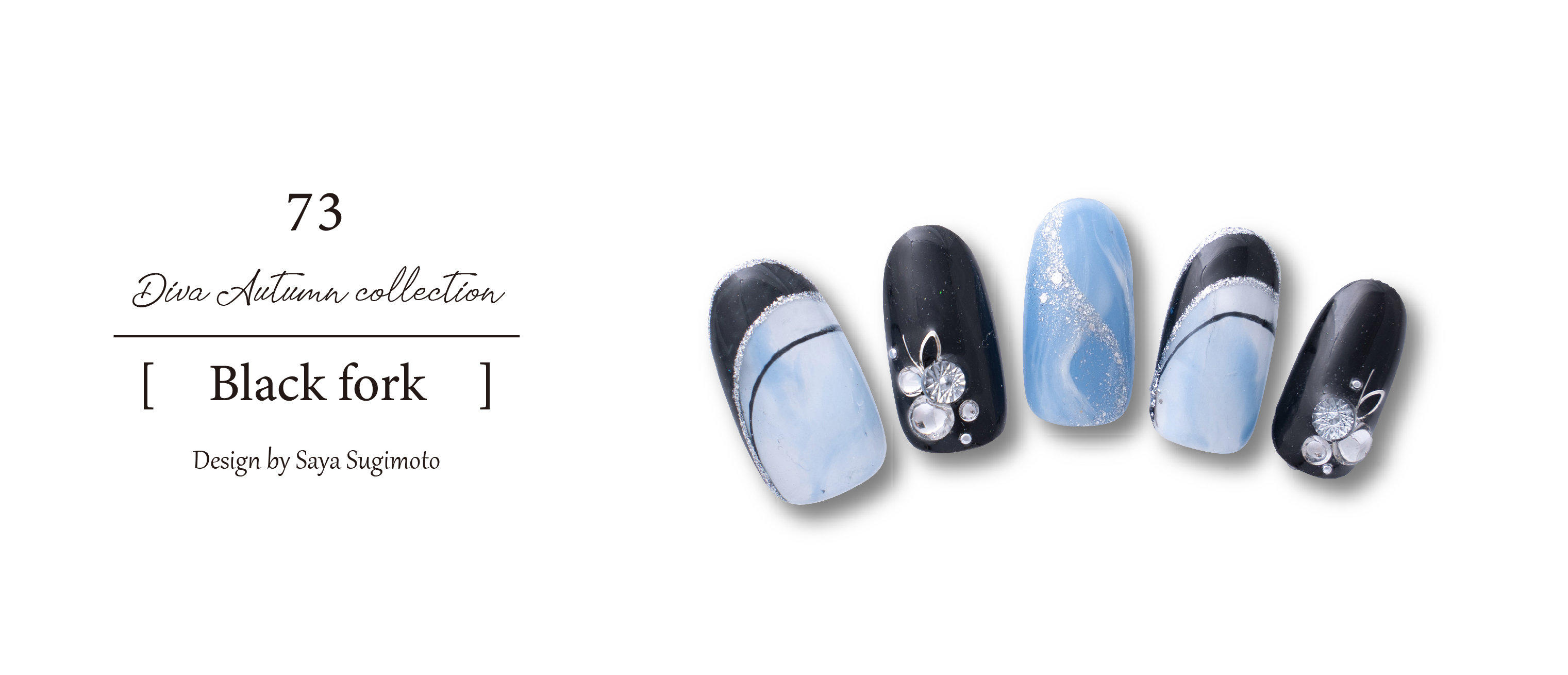 モノトーンカラーとブルーにシルバーラメで柔らかい雰囲気の中に黒でしまった大人のデザイン。