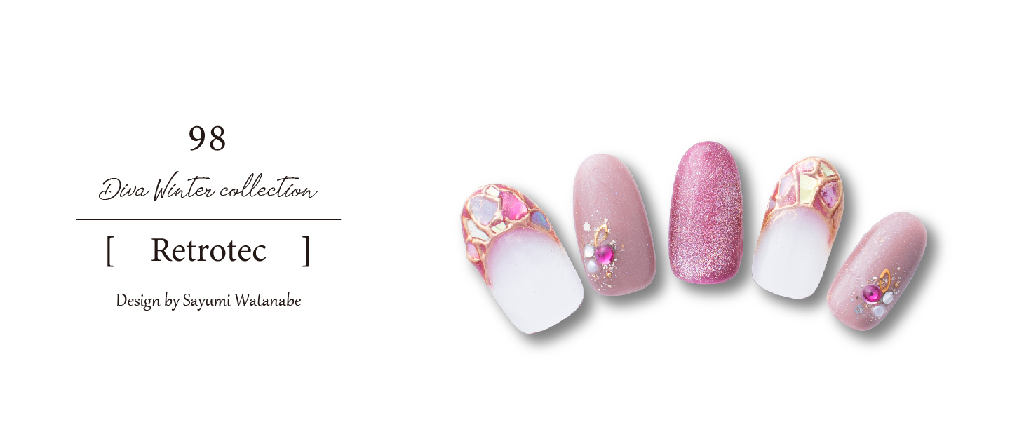 ミラーパウダーを使い凹凸感を出してnuanceな感じに仕上げました。透明感があり肌馴染みの良い配色でデザインが楽しめるように作成しました。