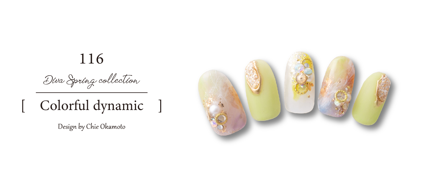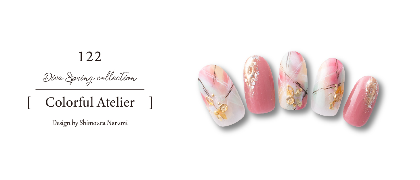 ピンク、グリーン、イエローのカラフルな色合いで春らしい印象に!濃いブラウンのラインとゴールドが可愛い中にもアクセントのある仕上がりにしました。