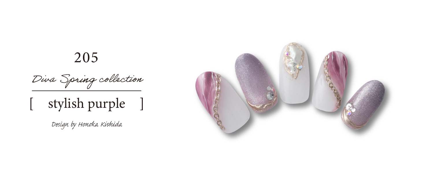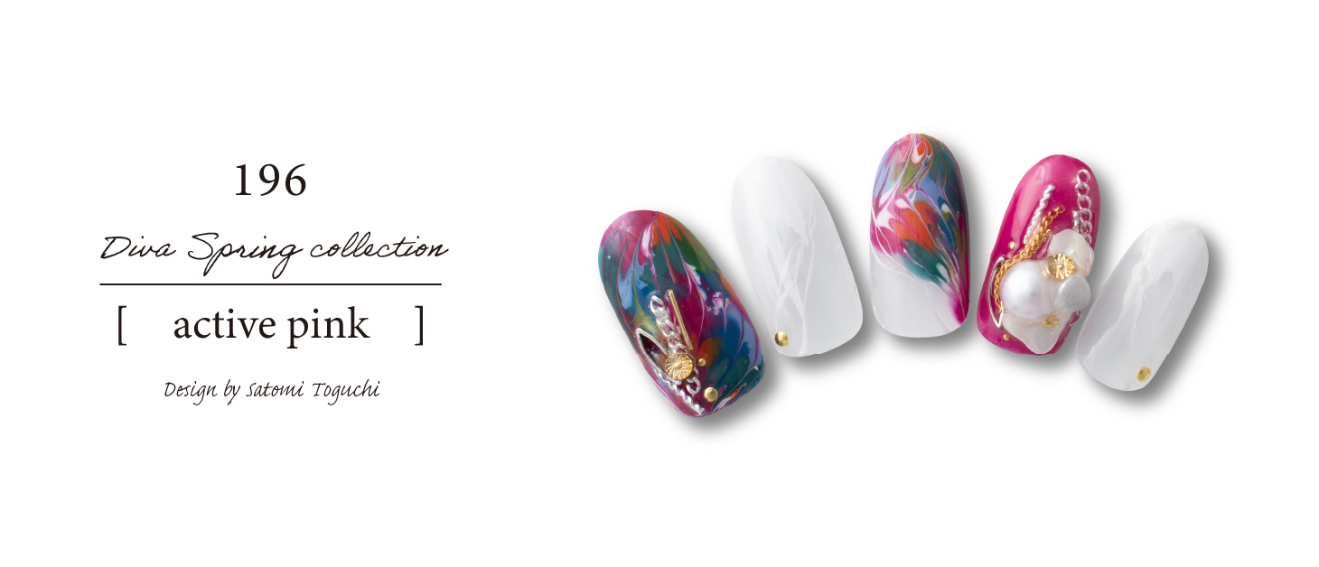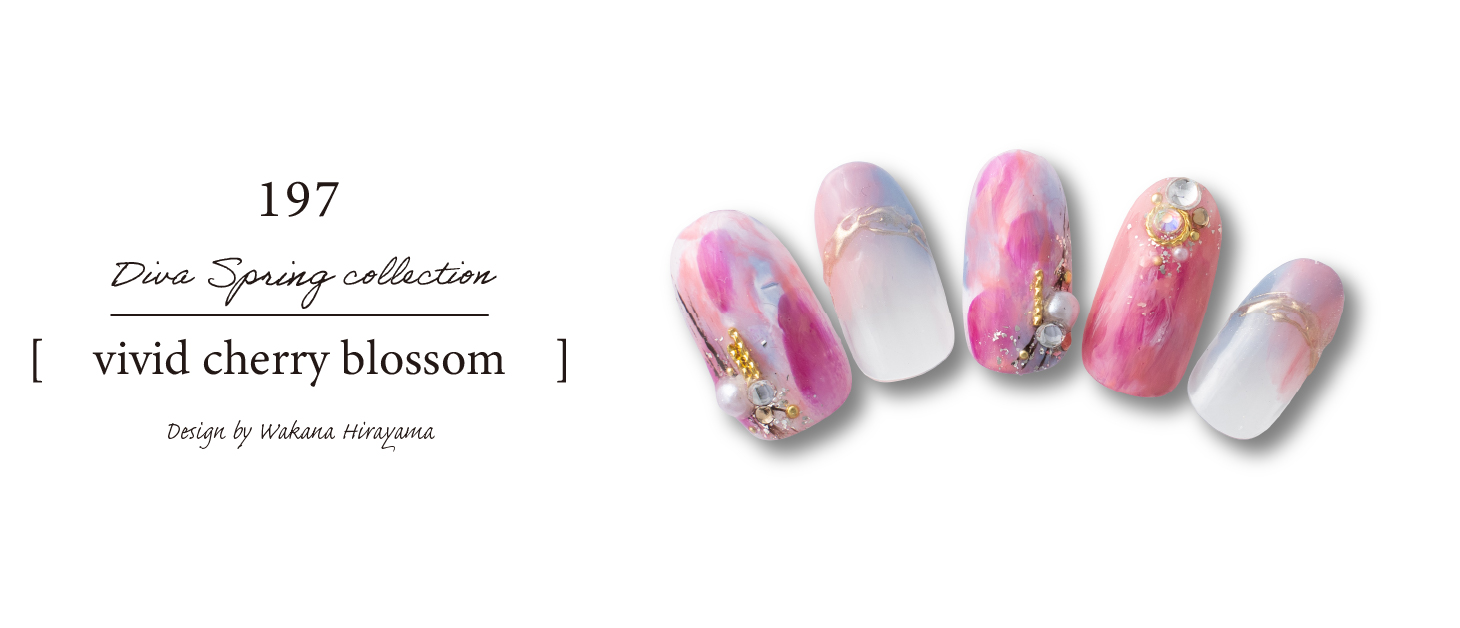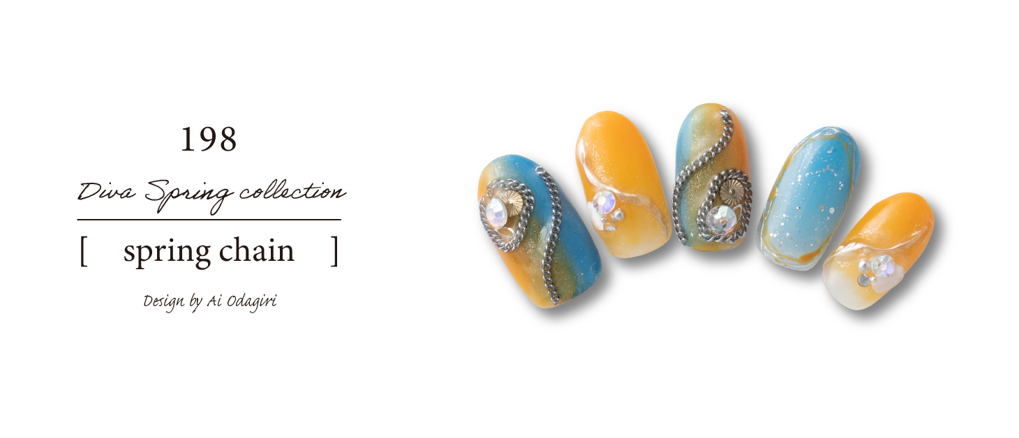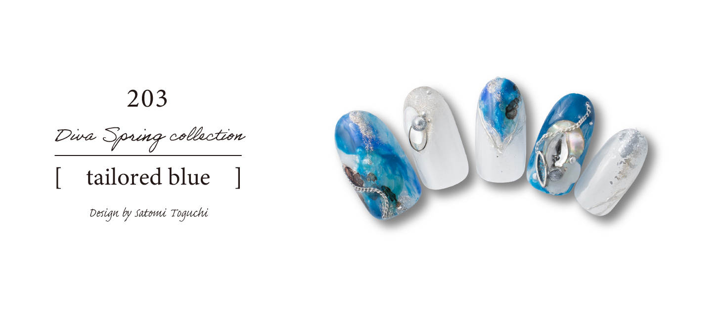 メインカラーはリバーブルーですがポイントに今季の春夏トレンドのコバルトブルーを入れました。フレッシュかつエネルギッシュなイメージですがストーンとシルバーでアクセントを出しまとめました。