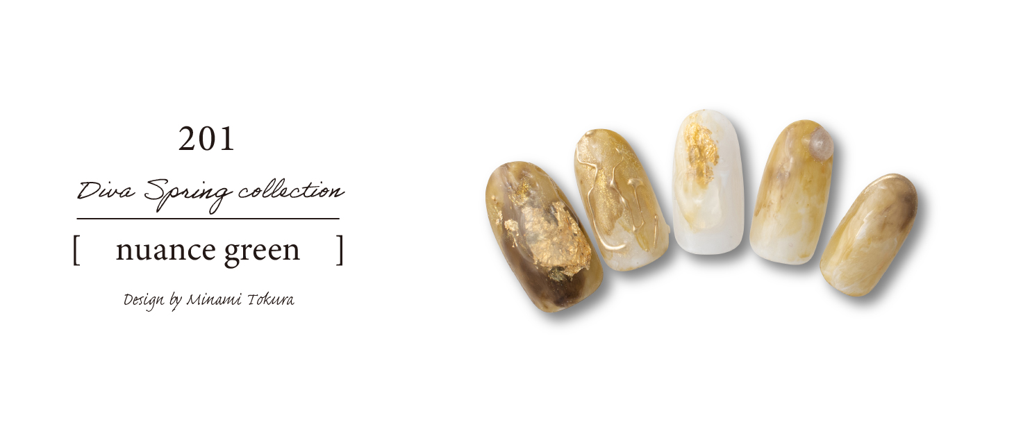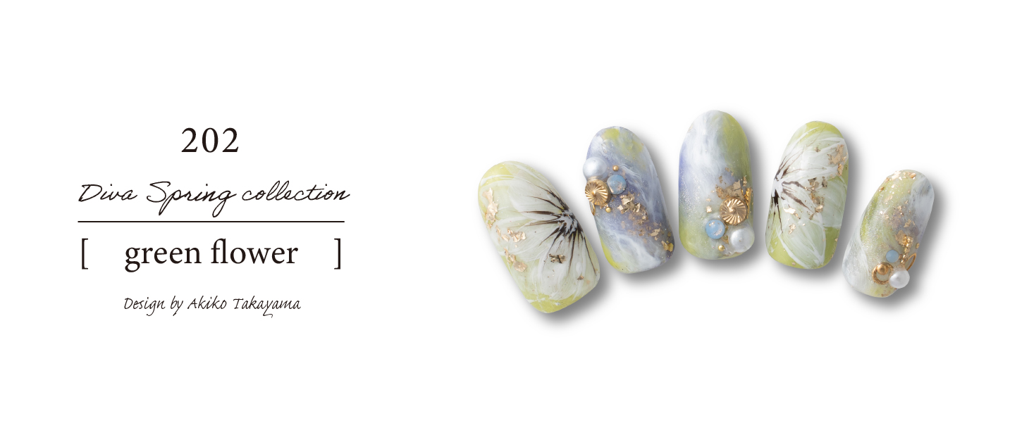 メインカラーのグリーンをつかって同系色でニュアンスでまとめたデザインです。 立体の指もあり凹凸を出したのと金箔も大胆に置くことで華やかになりました。