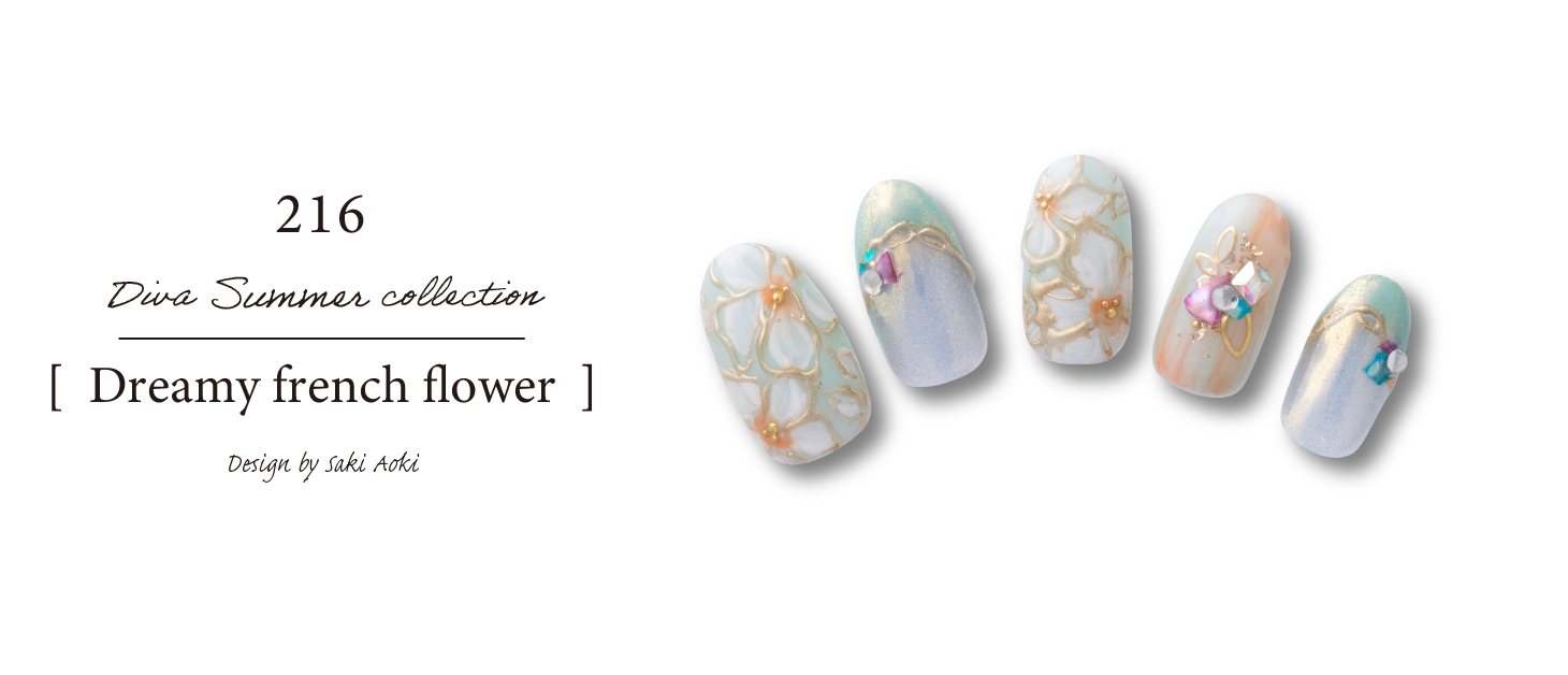 マグネットとオーロラを重ねトレンドを取り入れつつ、フェミニンなフラワーアートでどんなスタイルにも合わせやすく仕上げています。