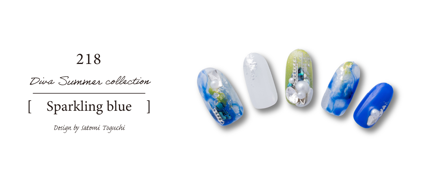トレンドワードでもあるスパークリングをイメージし、マグネットでベースとストーンパーツで華やかにしました。またクリア感を残しつつブルーで奥行き立体感を表しました。