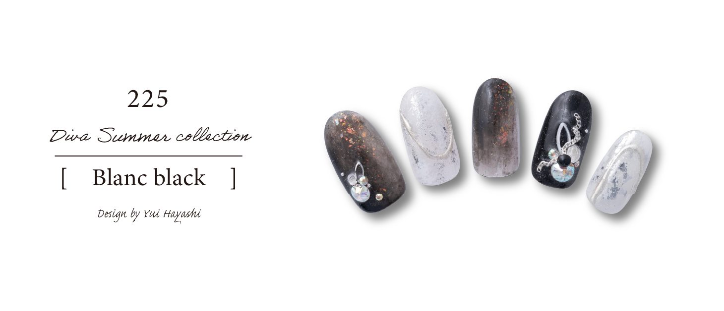 夏なのでシアー感がでるように透けてる部分がありつつも、黒がポイントになるように夏らしいオーロラストーンや白のパーツを使って大人っぽいかっこいい夏のイメージになるように仕上げました。